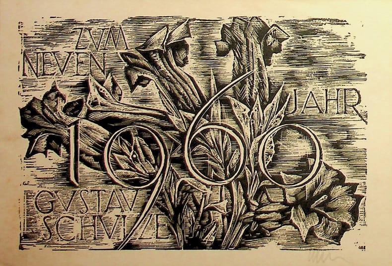 Hans Schulze (1904-1982), graveur allemand. Gravure signée, 1960, environ 115*170mm. Carte de voeux. [481]