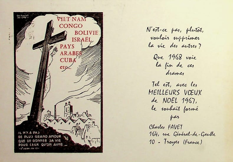 Charles Favet (1899-1982), dessinateur, graveur sur bois. Gravure sur bois, 1968, environ 105*155mm. Carte de voeux pour 1968. Au dos, adresse du destinataire et timbre. [481]