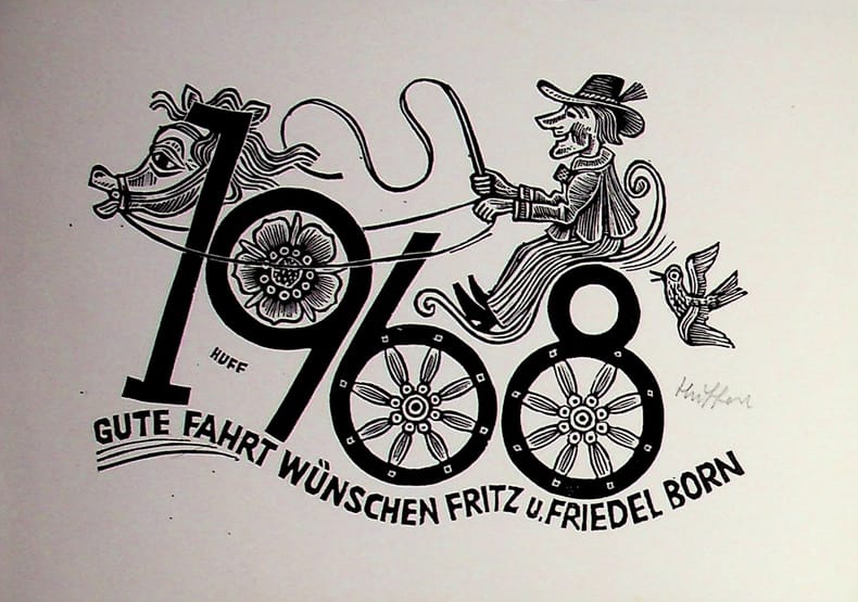 Hermann Huffert (1904-1995), artiste allemand, graveur. Gravure sur bois signée, 1968, environ 105*145mm. Carte de voeux pour Fritz et Friedel Born. Elle est signée « HUFF » dans la planche et « Huffert » au crayon. [481]