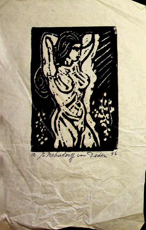 Erik Bronsdorff von Deden (1909-1991), artiste danois, graveur. Gravure signée, 1956, environ 220*140mm. Jolie gravure, papier fin froissé. [481]