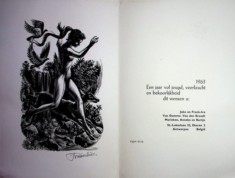 Frank-Ivo Van Damme (1932-), artiste, dessinateur de bande dessinée, graveur. Gravure signée au crayon, 1963, environ 210*140mm. Carte de voeux. [481]