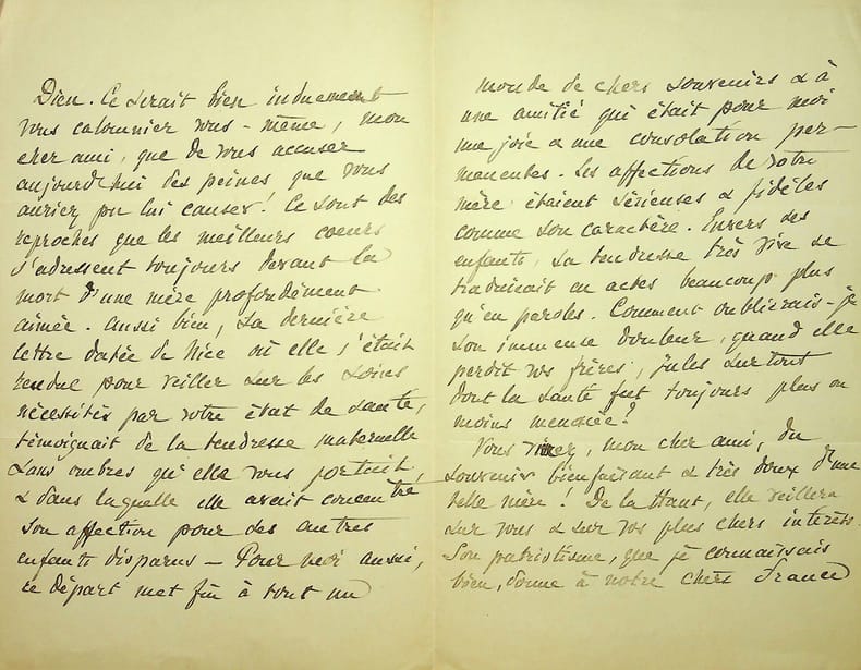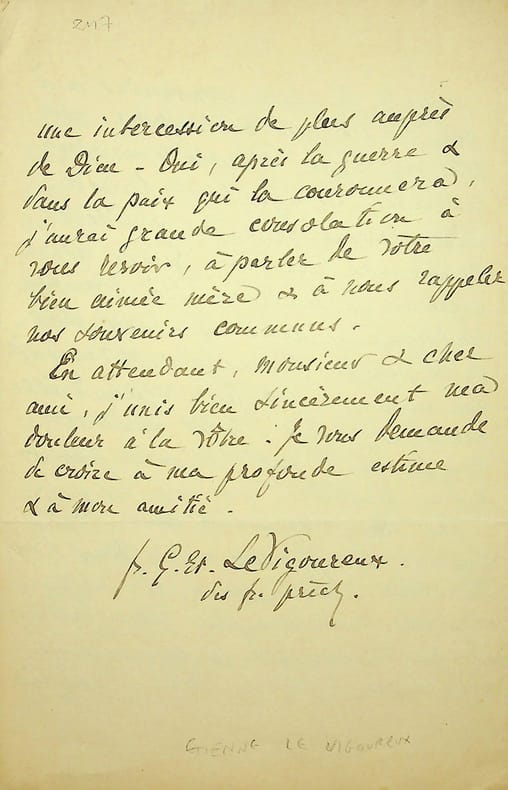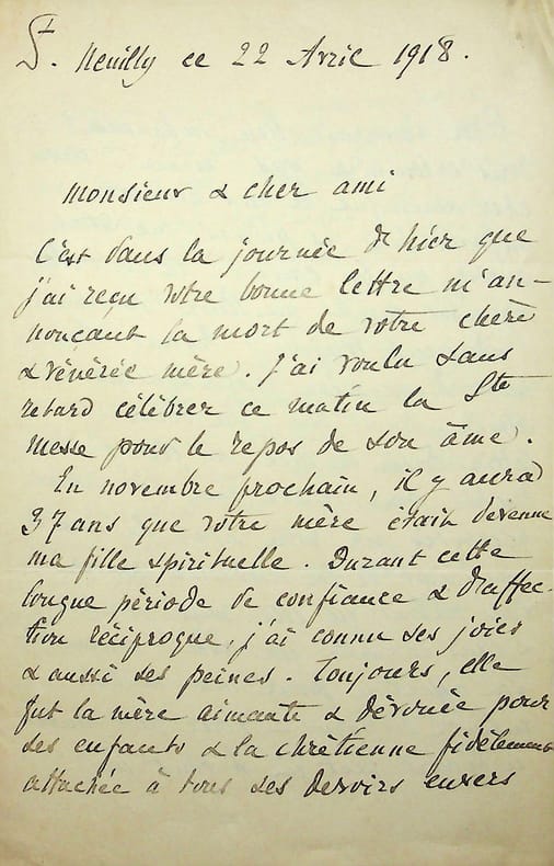 Etienne Le Vigoureux (1848-1922), prêtre dominicain, prieur du couvent Saint-Etienne de Jérusalem, prédicateur général de son ordre. L.A.S., Neuilly, 22 avril 1918, 4p in-8. Longue et belle lettre de condoléances au fils d'une de ses filles spirituelles, mettant en avant ses nombreuses qualités. Beau document. [482]
