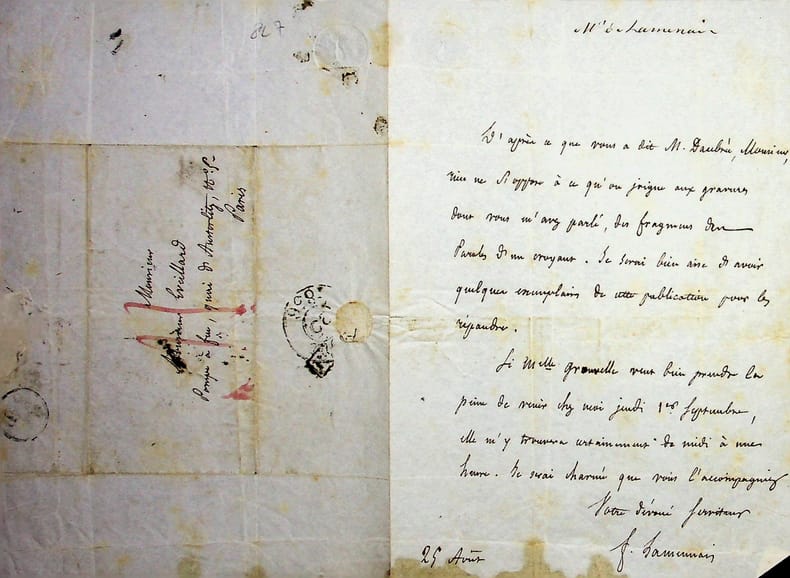 Félicité de La Mennais dit Lamennais (1782-1854), prêtre, philosophe, écrivain. L.A.S., 25 août 1836, 1p in-8. A M. Eveillard, à propos d'une publication : « D'après ce que vous a dit M. Daubrée, Monsieur, rien ne s'oppose à ce qu'on joigne aux gravures dont vous m'avez parlé, des fragments des Paroles d'un croyant. Je serai bien aise d'avoir quelques exemplaires de cette publication pour les répandre. Si mademoiselle Granville veut bien prendre la peine de voir chez moi jeudi 1er septembre, elle m'y trouvera certainement de midi à une heure. Je serai charmé que vous l'accompagniez. Votre dévoué serviteur F. Lamennais ». [482]