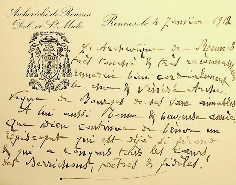 Auguste-René-Marie Dubourg (1842-1921), archevêque de Rennes, Dol et Saint-Malo, cardinal. L.A.S. à la troisième personne, Rennes, 4 janvier 1912, 1p in-12. A Louis-Ernest Dubois (1856-1929), archevêque de Bourges. « L'Archevêque de Rennes très touché & très reconnaissant remercie bien cordialement le cher & vénéré Archevêque de Bourges de ses voeux aimables. À lui aussi bonne & heureuse année ! Que Dieu continue de bénir un épiscopat qui est déjà si fécond & qui a conquis tous les coeurs des Berrichons, prêtes et fidèles ! ». [482]