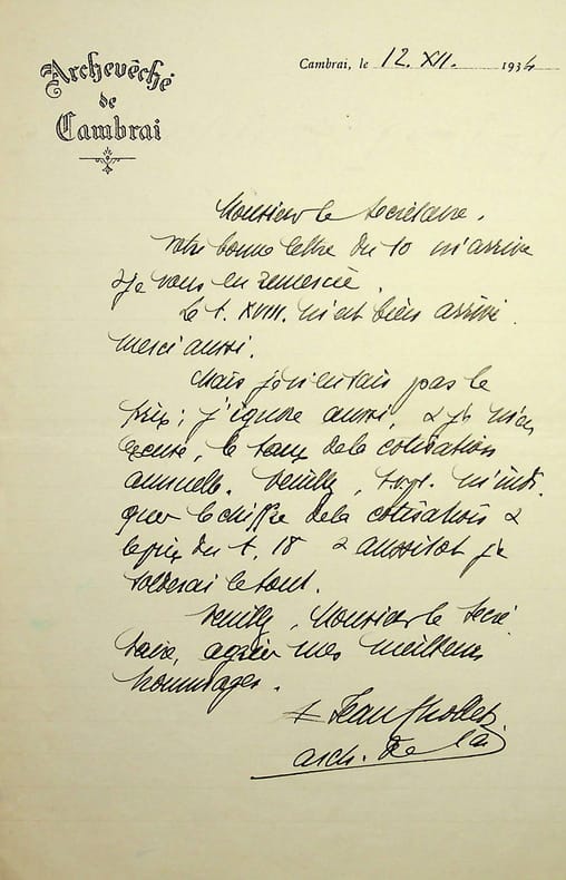Jean-Arthur Chollet (1862-1952), archevêque de Cambrai. L.A.S., Cambrai, 12 décembre 1934, 1p in-8. Au baron Charles-Hippolyte Renault (1858-1936), capitaine de cavalerie, secrétaire puis vice-président de la Société Philomathique de Verdun. « Monsieur le secrétaire, Votre bonne lettre du 10 m'arrive, je vous en remercie. Le t. XVIII m'est bien arrivé. Merci aussi. Mais je n'en sais pas le prix ; j'ignore aussi, & je m'en excuse, le taux de la cotisation annuelle. Veuillez, s.v.p., m'indiquer le chiffre de la cotisation & le prix du t. 18 & aussitôt je solderai le tout. Veuillez, Monsieur le secrétaire, agréer mes meilleurs hommages. Jean Chollet, arch. De C. ». [482]