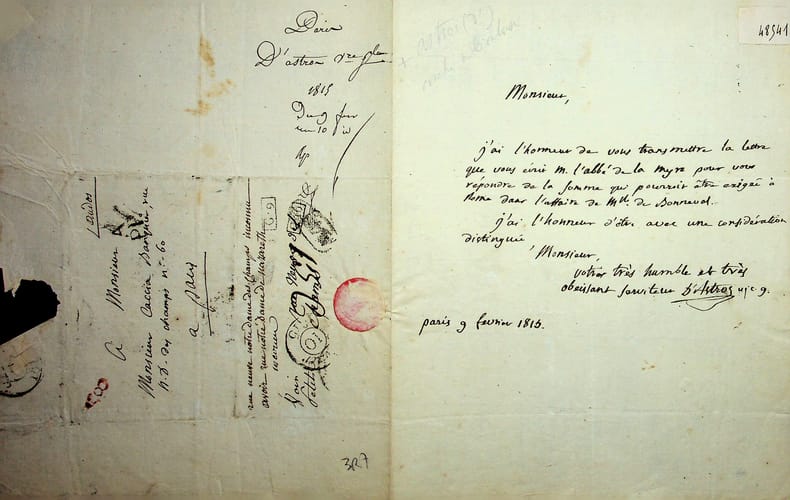 Paul-Thérèse-David d'Astros (1772-1851), évêque d'Orange puis Saint-Flour et Bayone, archevêque de Toulouse et Narbonne. L.A.S., Paris, 9 février 1815, 1p in-4. Au banquier Jacques-Gabriel Caccia (1771-1838). « Monsieur, j'ai l'honneur de vous transmettre la lettre que vous écrit M. L'abbé de La Myre pour vous répondre de la somme qui pourrait être exigée à Rome dans l'affaire de mademoiselle de Bonneval. J'ai l'honneur d'être avec une considération distinguée, Monsieur, votre très humble et très obéissant serviteur d'Astros vic.g. ». L'abbé de La Myre est Claude-Madeleine de La Myre-Mory (1755-1829) qui sera évêque de Troyes puis du Mans. [482]