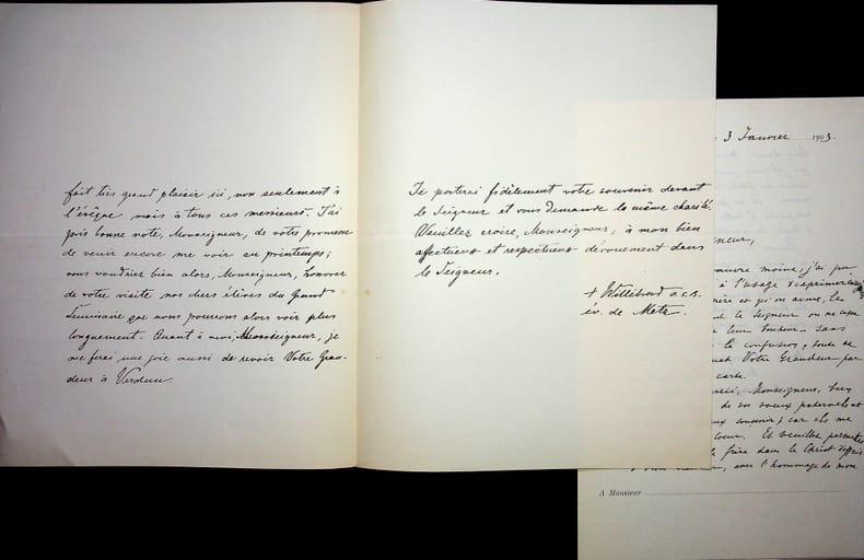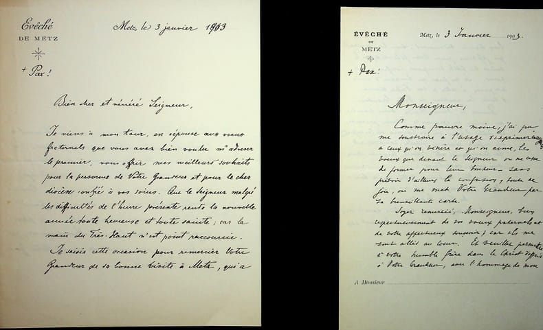 Willibrord Benzler (1853-1921), évêque de Metz, serviteur de Dieu. L.A.S., Metz, 3 janvier 1903, 3p in-4. A Louis-Ernest Dubois (1856-1929), alors évêque de Verdun. Belle lettre amicale de voeux et de remerciements pour la visite de Dubois à Metz. Il se fera une joie de le recevoir à nouveau. On joint une lettre de Dom Hilaire de Laet (1857-1937), bénédiction comme Benzler, qui l'avait suivi à Metz. Lettre de voeux. Laet était un bénédiction belge de l'abbaye de Maredsous qui fit partie des fondateurs de l'abbaye du Mont-César en 1888. [482]
