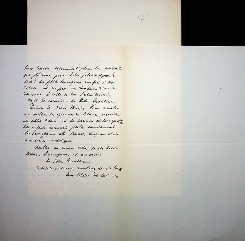 Alphonse-Gabriel Foucault (1843-1930), évêque de Saint-Dié. L.A.S., Saint-Dié, 16 août 1912, 3p in-8. A Louis-Ernest Dubois (1856-1929), ancien évêque de Verdun, alors archevêque de Bourges. Il demande son aide à l'ancien évêque de Verdun pour « l'érection de Nancy en archevêché ». « Cher Monseigneur, Voudriez-vous nous rendre un service que nous demandons beaucoup plus à l'ancien éêque de Verdun qu'au métropolitain de Bourges. Nous avons introduit à Rome la demande de l'érection de Nancy en archevêché. Ce projet a trouvé bon accueil près du Pape [Pie X], du cardinal Merry del Val et du cardinal de Lai. L'étude de la question se poursuit assez activement mais pour reconstituer la province de Besançon, il faut amputer Lyon, qui a promis d'y consentir, et pour réparer la brèche faite à Lyon, nous vous demanderons de céder [fin de la phrase illisible]. Vous ne le refuseriez pas à la Lorraine et à la province de Jeanne d'Arc. Sur la demande de la Concistoriale, nous pensons proposer les combinaisons suivantes : Nancy, avec St-Dié et Verdun. Besançon avec Langues, Dijon et St Claude. Lyon, avec Belley, Autun, Grenoble et. Le Puy. Donc Nancy avec 2 suffrageants, Besançon avec 3, Lyon avec 4 et Bourges avec 5. Voilà le [mot illisible]. Je regrette que Chartres n'ait pas fourni le nouveau titulaire. Je vous renouvelle, cher Monseigneur, mes respectueux et fraternels hommages. AG Ev. de St Dié ». Cette érection n'eut pas lieu. Belle lettre. [482]