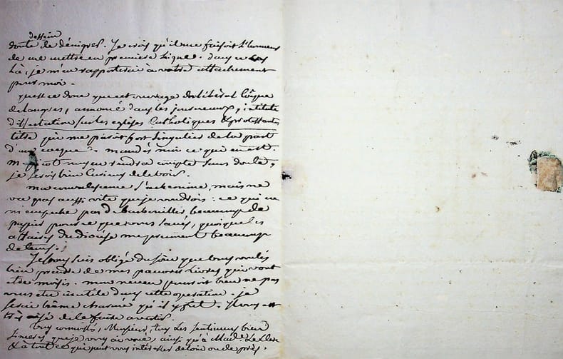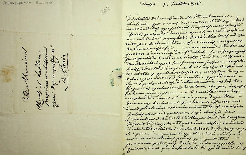 Etienne-Antoine Boulogne (1747-1825), évêque de Troyes. L.A., Troyes, 1er juillet 1816, 2p in-4. Au libraire Adrien Leclerc. Longue et très intéressante lettre. Après l'avoir remercie pour ses bulletins, il regrette la publicité qui y a été faite pour le « détestable pamphlet de l'abbé Vinson qui n'est pas seulement un fou mais un gueux de mauvaise fois ». Pierre Vinson (1763-1820) venait en effet de publier Le Concordat expliqué au roi, suivant la doctrine de l'Eglise. Il est question du rappel de l'archevêque de Saint-Malo, Courtois de Pressigny, signe que la tentative d'un nouveau Concordat n'a pas abouti ; de la publication d'oeuvres d'un « Tourangeau », certainement Louis-Mathias de Barral, évêque de Tours mort un mois plus tôt, pour lesquelles Boulogne souhaite qu'elles soient en partie censurées. Il demande aussi des informations sur l'ouvrage, à paraître, « du libéral évêque de Langres [.] intitulé Dissertation sur les églises catholiques & protestantes ». Il s'agit du cardinal de La Luzerne (1738-1821). Belle lettre. [482]