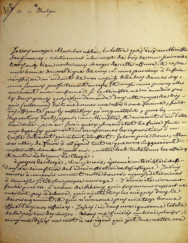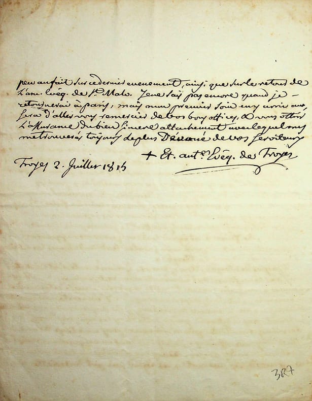 Etienne-Antoine Boulogne (1747-1825), évêque de Troyes. L.A.S., Troyes, 2 juillet 1815, 1p 1/2 in-4. Longue lettre à un abbé, à propos d'un affaire de coupe de bois et d'affaires du clergé, mentionnant notamment l'archevêque de Reims, i.e. Alexandre de Talleyrand-Périgord, et l'archevêque de Saint-Malo, i.e. Courtois de Pressigny. [482]