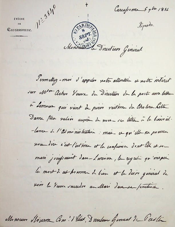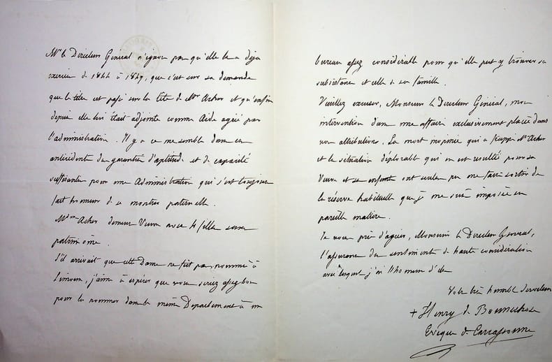 Henri de Bonnechose (1800-1883), évêque de Carcassonne puis d'Evreux, archevêque de Rouen, cardinal. L.A.S., Carcassonne, 5 septembre 1854, 3p in-4. A Augustin Stourm (1797-1865), directeur général des Postes. Il lui recommande longuement madame Artur, veuve du directeur de la poste aux lettres de Limoux, afin qu'elle succède à son mari. Il met en avant ses qualités, le fait qu'elle a déjà exercé, qu'elle était l'adjointe de son mari, etc. Belle lettre. [482]