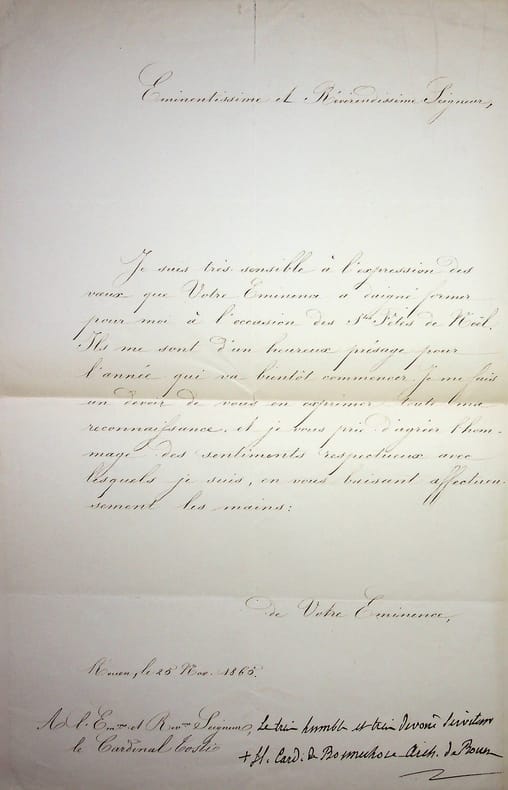 Henri de Bonnechose (1800-1883), évêque de Carcassonne puis d'Evreux, archevêque de Rouen, cardinal. L.S., Rouen, 25 novembre 1865, 1p in-folio. Au cardinal Antonio Tosti (1776-1866). Belle lettre pour le remercie de ses voeux pour les fêtes de Noël. Bonnechose a juste signé, avec la formule de politesse : « Le très humble et très dévoué serviteur +H Card. de Bonnechose arch. de Rouen ». [483]