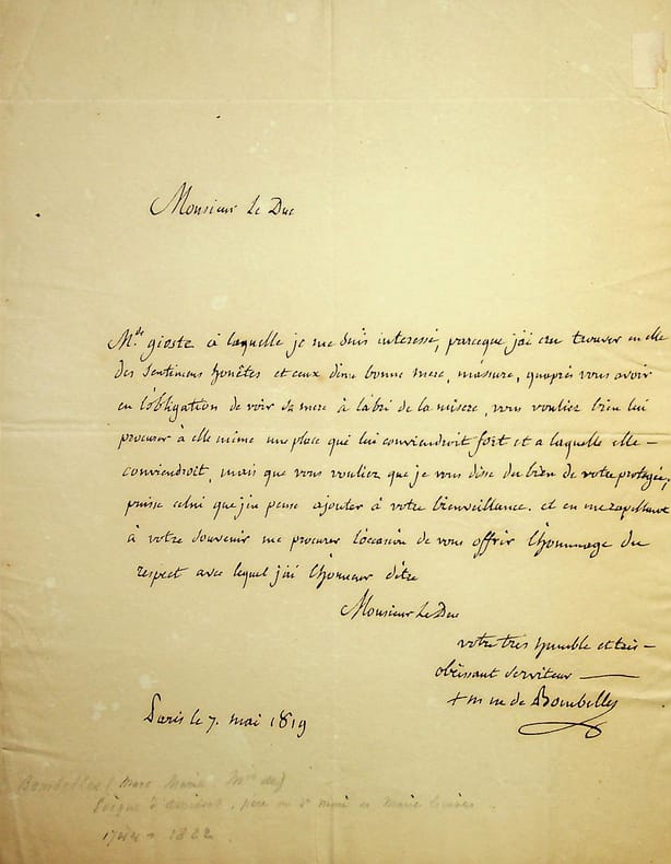 Marc-Marie de Bombelles (1744-1822), officier, diplomate, évêque d'Amiens. L.A.S., Paris, 7 mai 1819, 1p in-4. A un duc, pour lui recommander madame Gioste. [483]