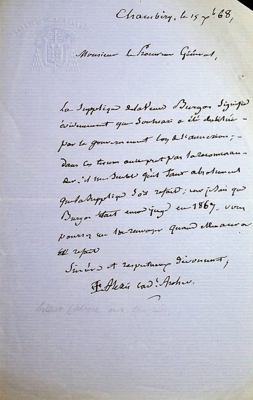 Alexis Billiet (1783-1873), archevêque de Chambery, cardinal, sénateur. L.A.S., Chambéry, 15 décembre 1868, 1p in-8. A propos d'une supplique pour la veuve Burgos qui est mal faite car on comprend que son mari a été destitué lors de l'annexion (1860) alors qu'il était encore juge en 1867. [483]