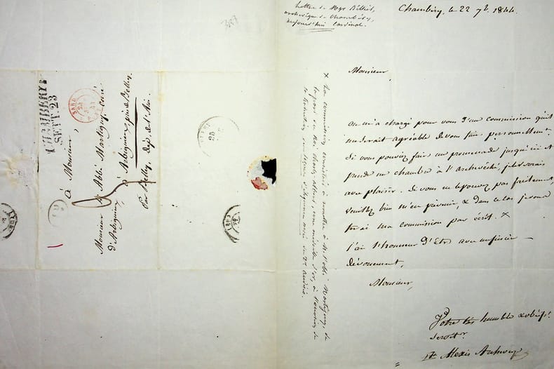 Alexis Billiet (1783-1873), archevêque de Chambery, cardinal, sénateur. L.A.S., Chambery, 22 septembre 1844, 1p in-4. A l'abbé Joseph-Alexandre Martigny (1808-1880), curé d'Aubignieu près de Bellay (Ain) et archéologue. Il l'invite à venir à Chambery pour une commission qu'il souhaite lui faire de vive-voix mais qu'il lui fera par écrit s'il ne peut venir. Une note indique : « la commission consistait à remettre à M. l'abbé Martigny, de la part du Roi Charles-Albert, une médaille d'or, à l'occasion de sa traduction des Leçons d'éloquence sacrée du Dr Audisio ». [483]