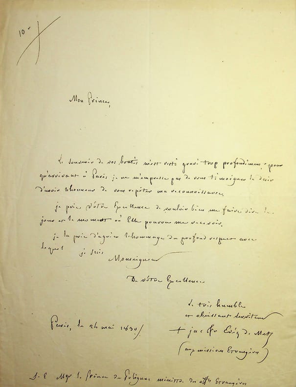 Jacques-François Besson (1756-1842), évêque de Metz. L.A.S., Paris, 24 mai 1830, 1p in-4. Au prince Jules de Polignac (1780-1847), dernier ministre des affaires étrangères de Charles X. Il souhaite le rencontrer pour lui exprimer sa reconnaissance. [483]