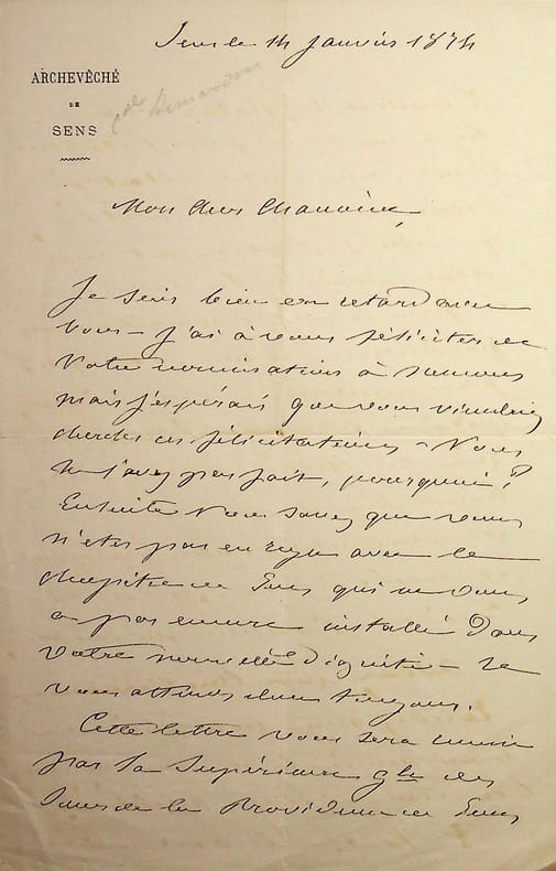 Victor-Félix Bernadou (1816-1891), évêque de Gap, archevêque de Sens, cardinal. L.A.S., Sens, 14 janvier 1874, 2p in-8. Lettre amicale à un chanoine qui vient d'avoir une nomination, mentionnant aussi le legs d'une rente pour l'établissement d'une crèche. [483]