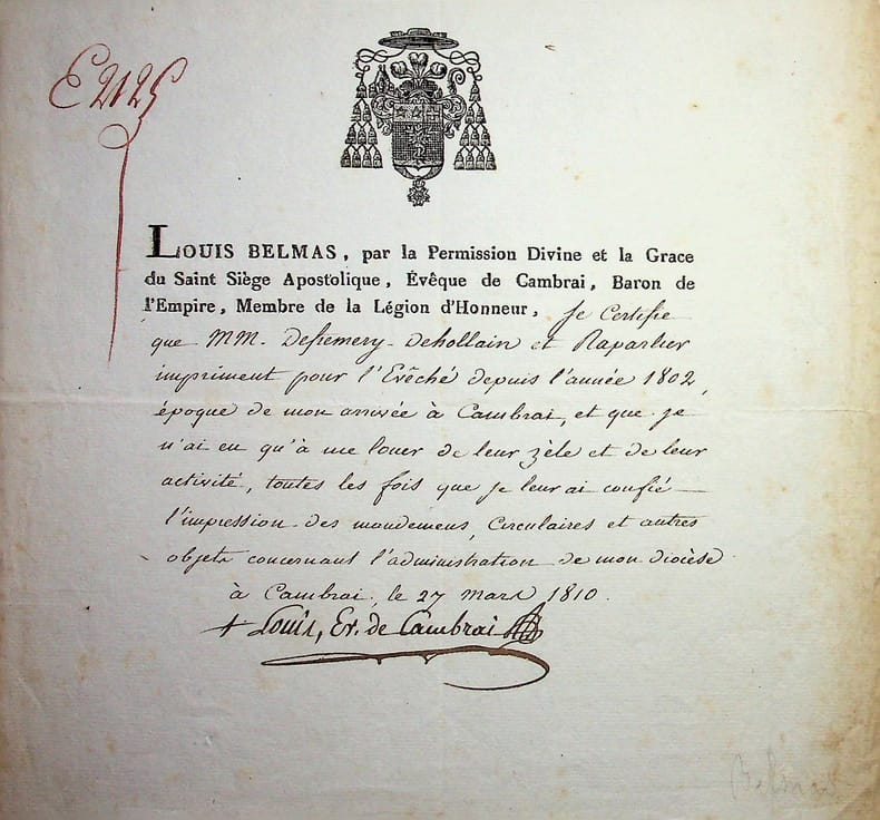 Louis Belmas (1757-1841), évêque de Cambrai. L.S., Cambrai, 27 mai 1810, 1p in-8. Certificat de bons services pour les imprimeurs Defremery-Dehollain et Raparlier, imprimeurs de l'évêché depuis 1802. [483]