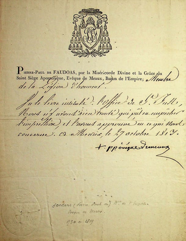 Pierre-Paul de Faudoas (1750-1824), évêque de Meaux, chanoine de Saint-Denis. L.S., Meaux, 27 octobre 1813, 1p in-4. Approbation épiscopale pour un ouvrage, l'Office de Saint Just. Cet ouvrage est l'oeuvre de l'abbé N-H Goffart qui le publiera en 1814 (à Sens, chez Tarbé). [483]