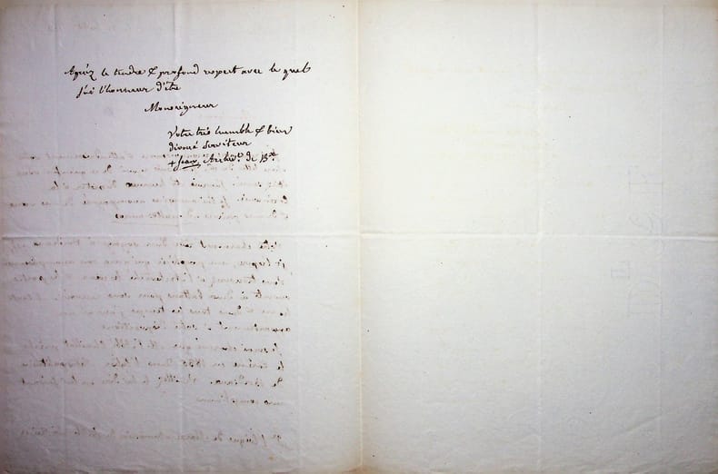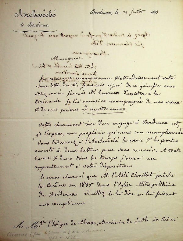 Jean Lefebvre de Cheverus (1768-1836), missionnaire, premier évêque de Boston (USA) puis de Montauban, archevêque de Bordeaux, cardinal. L.A.S., Bordeaux, 21 juillet 1833, 1p 1/2 in-4. À Marie-Nicolas-Silvestre Guillon (1759-1847), évêque de Maroc et aumônier de la reine. Il se réjouit de son sacre épiscopal auquel il n'a pu aller, espère sa visite à Bordeaux et demande que l'abbé Chaillot prêche le carême à Bordeaux en 1835. Belle lettre. [483]