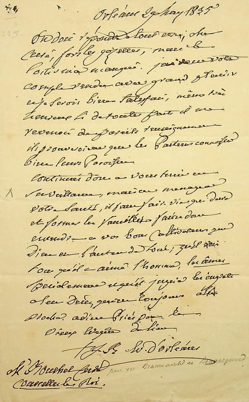 Jean Brumauld de Beauregard (1749-1841), évêque d'Orléans. L.A.S., Orléans, 29 mai 1835, 1p in-8. Au curé de Courcelles-le-Roi, [Bouchel?]. Difficile à lire. Il semble qu'il souhaite le maximum de renseignements sur la paroisse de son curé. [483]