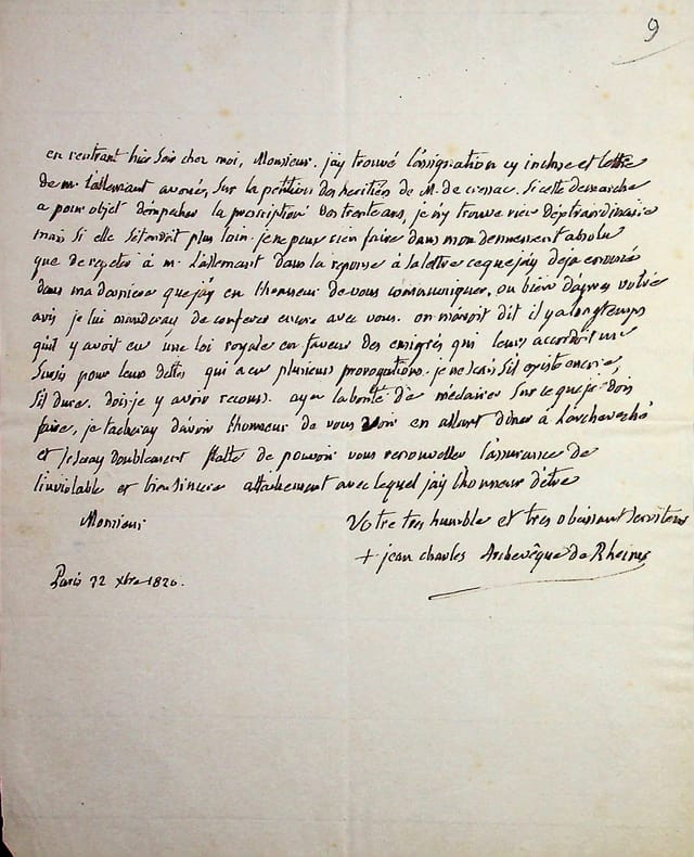 Jean-Charles de Coucy (1746-1824), évêque de La Rochelle, archevêque de Reims. L.A.S., Paris, 22 décembre 1820, 1p in-4. A propos d'une démarche faites par les héritiers de M de Cressac (bien des émigrés pendant la révolution). [483]