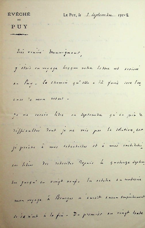 Thomas François Boutry (1845-1925), évêque du Puy-en-Velay. L.A.S., Le Puy, 1er septembre 1912, 2p in-8. A Louis-Ernest Dubois (1856-1929), alors archevêque de Bourges. A propos d'une invitation à Bourges. Boutry ne pourra pas venir en septembre mais le pourra en octobre. [484]