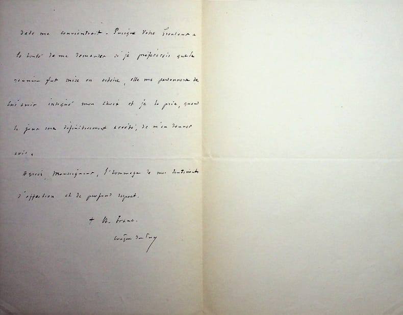 Auguste-René-Marie Dubourg (1842-1921), archevêque de Rennes, Dol et Saint-Malo, cardinal. L.A.S. à la troisième personne, Rennes, 4 janvier 1912, 1p in-12. A Louis-Ernest Dubois (1856-1929), archevêque de Bourges. « L'Archevêque de Rennes très touché & très reconnaissant remercie bien cordialement le cher & vénéré Archevêque de Bourges de ses voeux aimables. À lui aussi bonne & heureuse année ! Que Dieu continue de bénir un épiscopat qui est déjà si fécond & qui a conquis tous les coeurs des Berrichons, prêtes et fidèles ! ». [482]