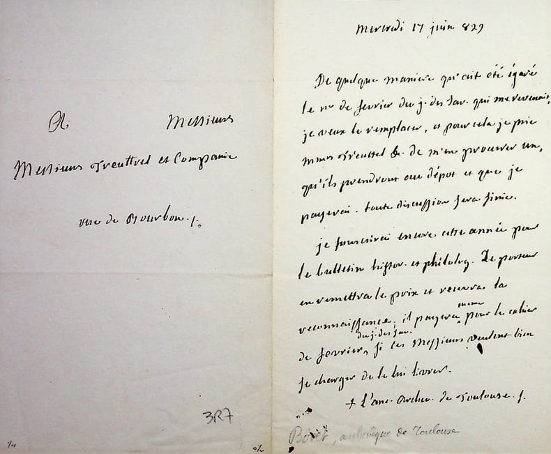 François de Bovet (1745-1838), évêque de Sisteron, archevêque de Toulouse. L.A.S., mercredi 17 juin 1829, 1p in-8. Aux libraires Treuttel et Würtz [orthographiés Treuttrel et Compagnie]. Il souhaite un exemplaire du Journal des savants de février qu'il n'a pas reçu et annonce souscrire pour le Bulletin historique et philologique. Il signe « +l'anc. Archev. de Toulouse », étant en retraite depuis 1820. Peu commun. [484]