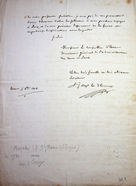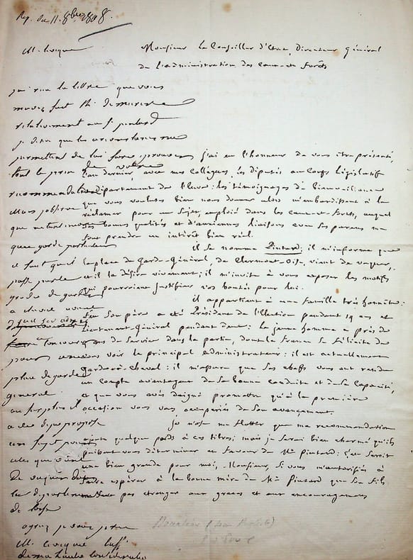Jean-Baptiste Bourlier (1731-1821), évêque d'Evreux, sénateur de l'Eure, baron et comte d'Empire. L.A.S., Evreux, 5 octobre 1808, 1p 1/2 in-folio. À Joseph-Alexandre Bergon (1741-1824), directeur général des Forêts. Longue lettre de recommandation pour un nommé Pintard qui souhaite une place de garde général à Clermont (Oise). Il encense longuement ses qualités. En marge, brouillon autographe de la réponse. [484]