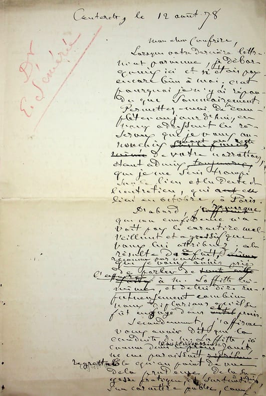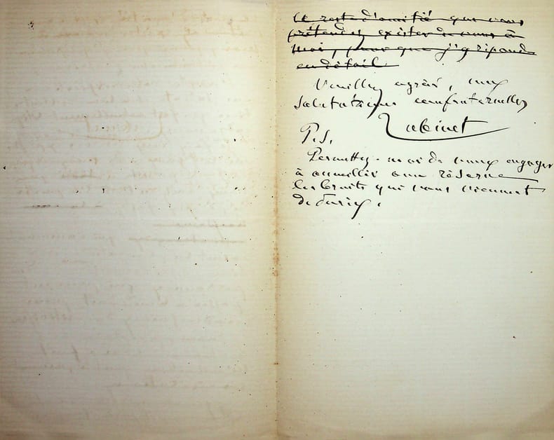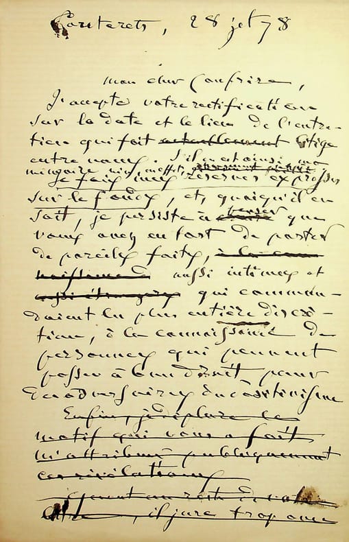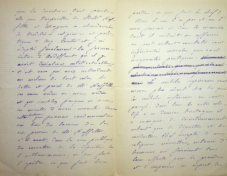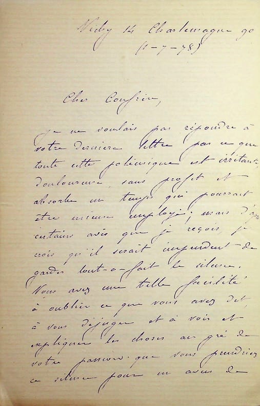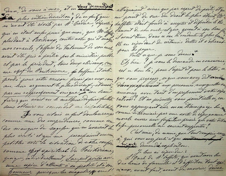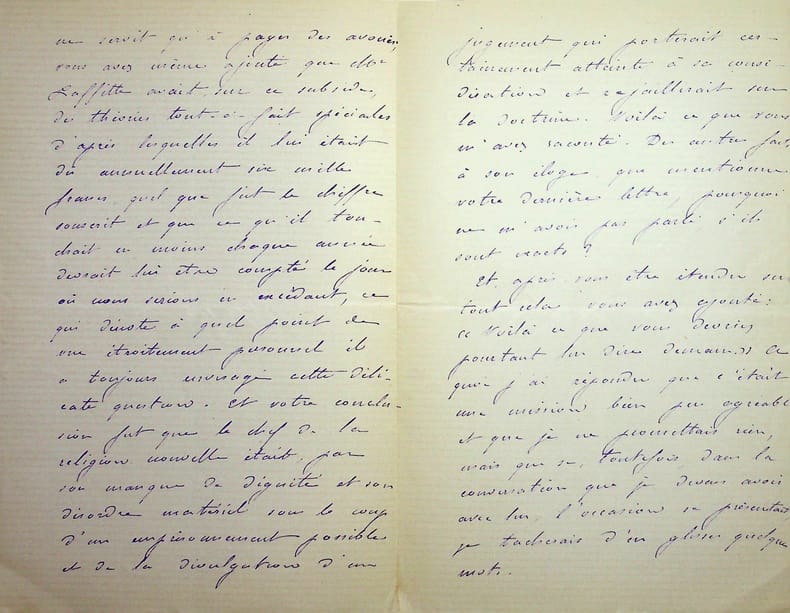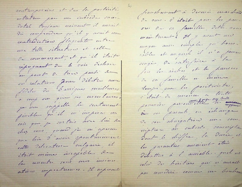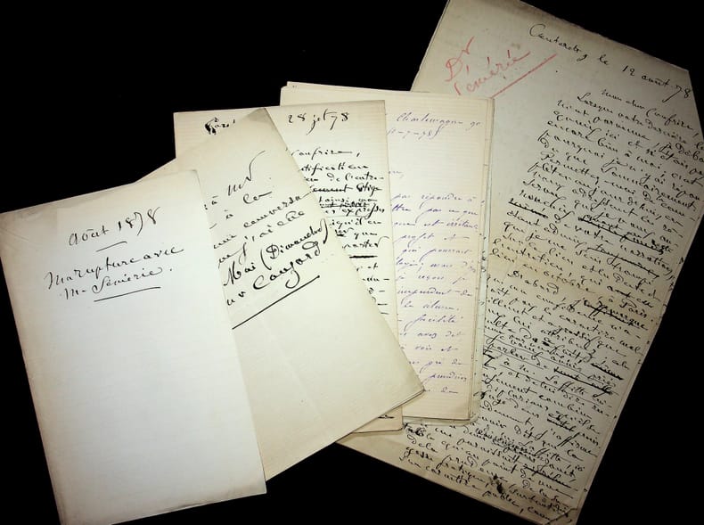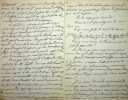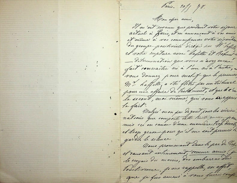 [Positivisme] Jean-François Robinet (1825-1899), médecin, historien, communard, médecin d'Auguste Comte, important membre de l'église positiviste. 3 brouillons dont 2 A.S., 19 mai, 28 juillet & 12 août 1878, 7p 1/2 in-8 & 8p in-folio. Au docteur Eugène Sémérie (1832-1884), positiviste, au moment de la rupture, dans une petite chemise « août 1878 - ma rupture avec M. Sémérie ». Très intéressant ensemble de trois brouillons, le premier d'un autre main (avec quelques corrections autographes) et les deux autres entièrement autographes et signés. Alors qu'ils étaient amis, Sémérie et Robinet se sont éloignés jusqu'à la rupture en août 1878 (et l'exclusion de Sémérie en 1879). La lettre de mai nous donne l'origine de cette rupture : Sémérie racontait dès mai 1878 qu'il était en rupture avec Pierre Laffitte et Robinet, critiquant notamment Laffitte pour une histoire de testament et succession (familiale) qui s'est fini au tribunal. Robinet lui en avait parlé en lui demandant « la plus entière discrétion ». Il est question d'un entretien en juillet. Le brouillon d'août, d'une très grande longueur, détaille tous ces problèmes et montre que le but de Sémérie était de faire un coadjutariat au sein de l'Eglise positiviste, position que Robinet avait dans un premier temps partagé avant de comprendre le but de Sémérie. On joint la très importante lettre du docteur Sémérie à Robinet, datée du 1er juillet 1878, à laquelle Robinet répond. Très importants documents autour d'un des schismes positivistes les plus importants. [484]