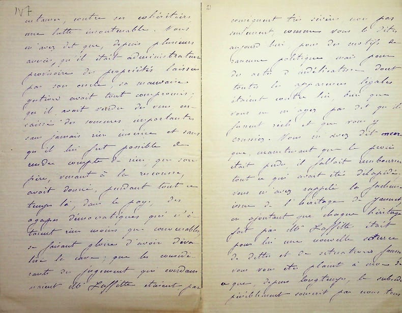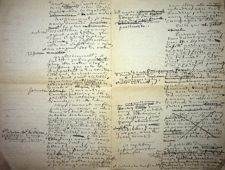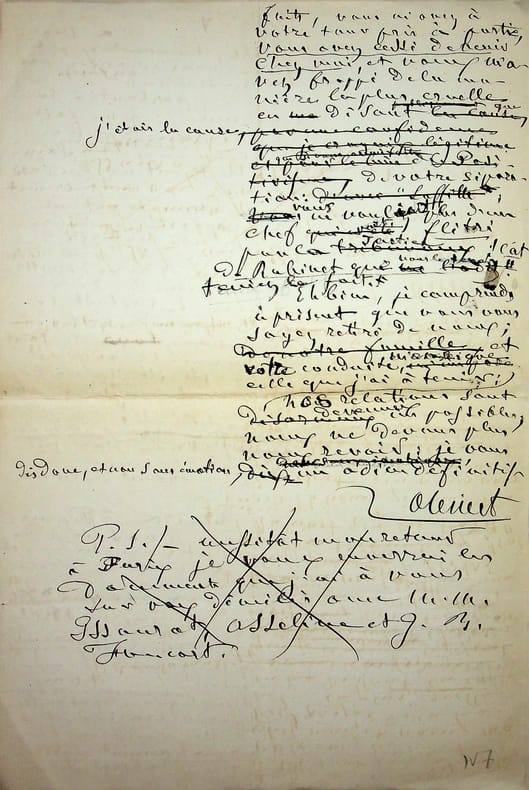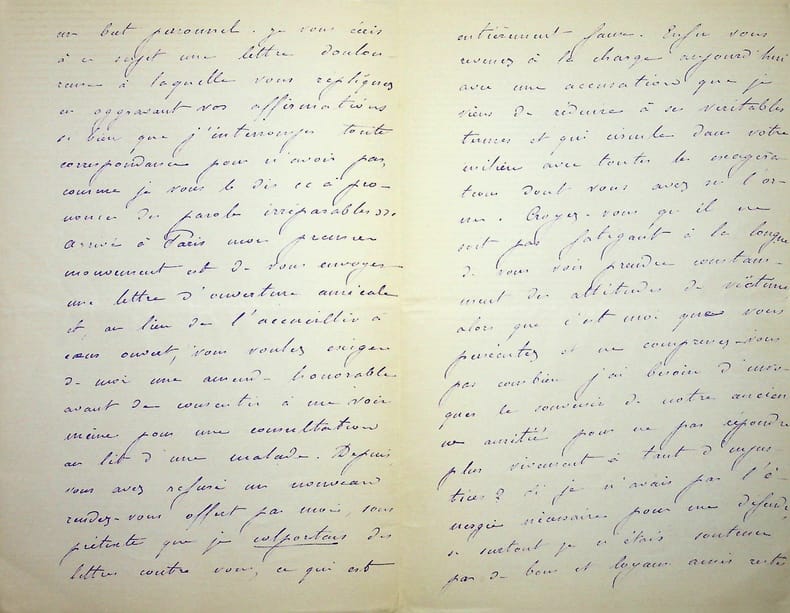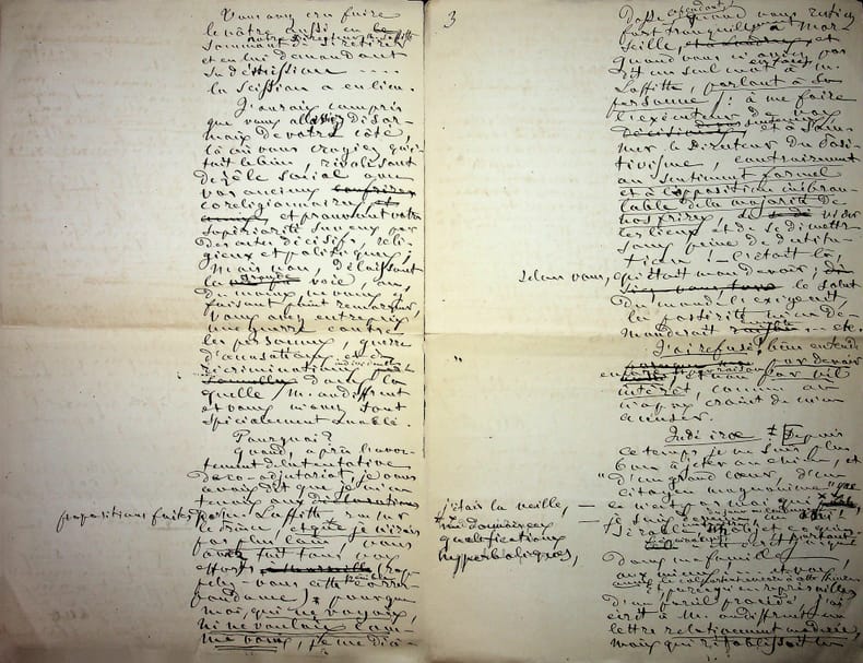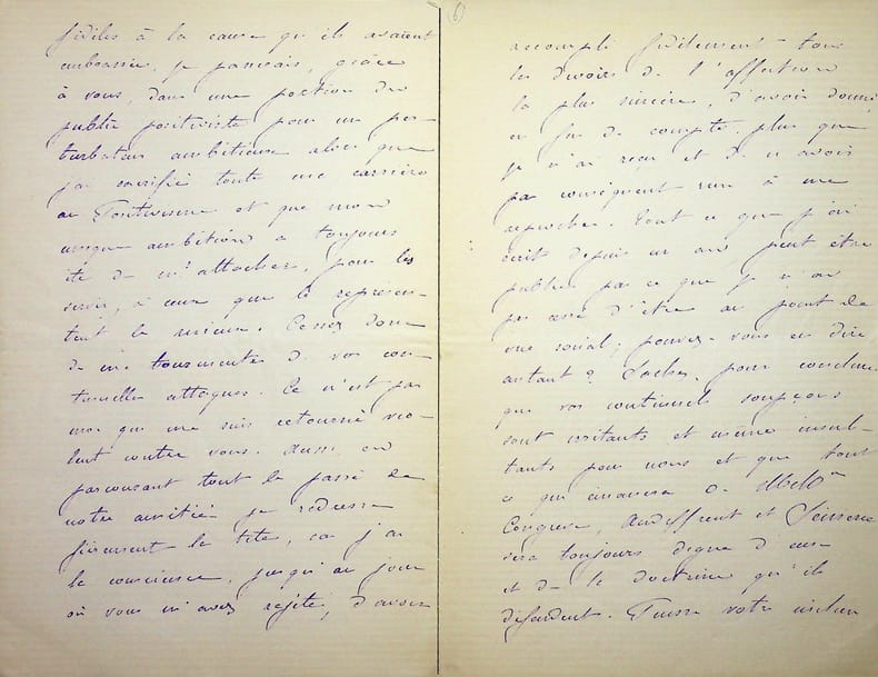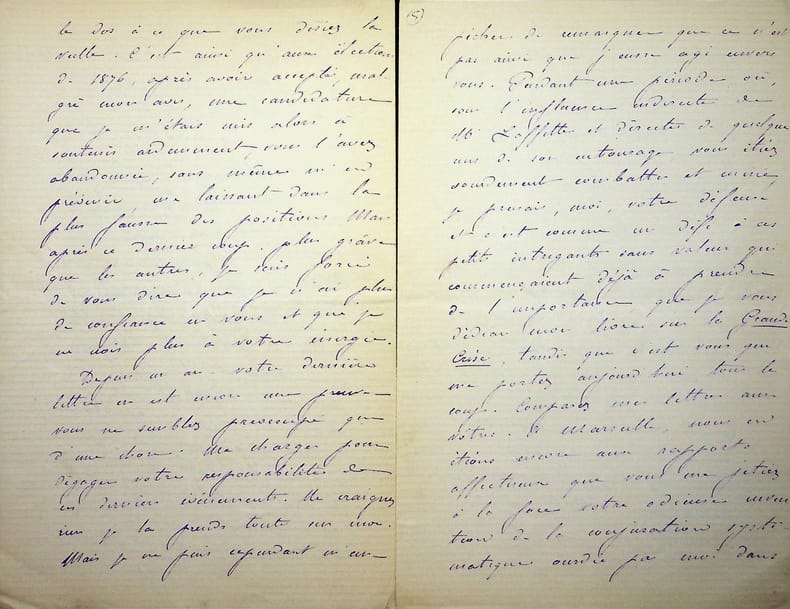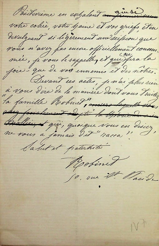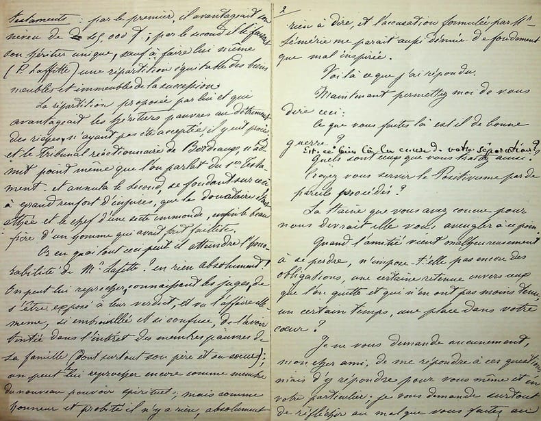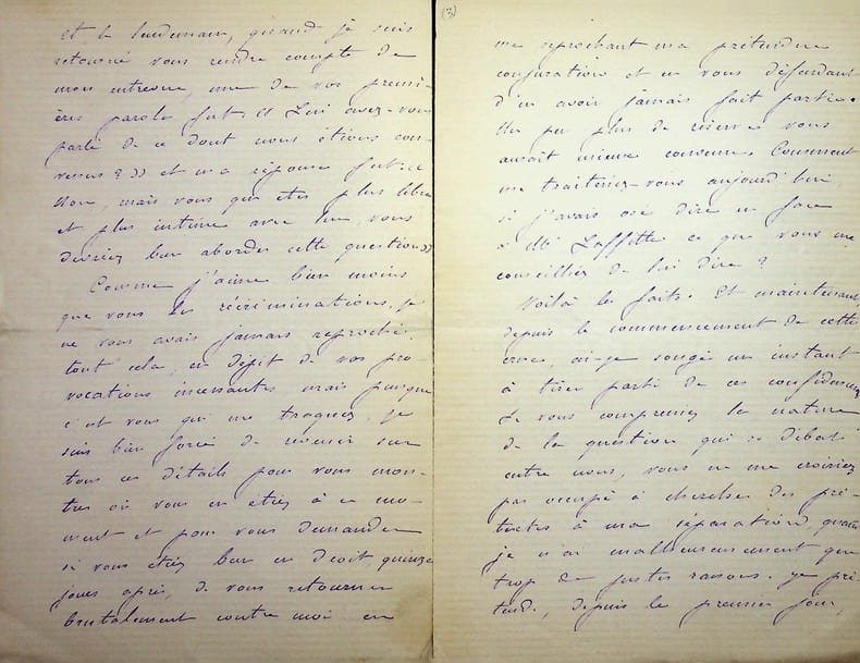 [Positivisme] Jean-François Robinet (1825-1899), médecin, historien, communard, médecin d'Auguste Comte, important membre de l'église positiviste. 3 brouillons dont 2 A.S., 19 mai, 28 juillet & 12 août 1878, 7p 1/2 in-8 & 8p in-folio. Au docteur Eugène Sémérie (1832-1884), positiviste, au moment de la rupture, dans une petite chemise « août 1878 - ma rupture avec M. Sémérie ». Très intéressant ensemble de trois brouillons, le premier d'un autre main (avec quelques corrections autographes) et les deux autres entièrement autographes et signés. Alors qu'ils étaient amis, Sémérie et Robinet se sont éloignés jusqu'à la rupture en août 1878 (et l'exclusion de Sémérie en 1879). La lettre de mai nous donne l'origine de cette rupture : Sémérie racontait dès mai 1878 qu'il était en rupture avec Pierre Laffitte et Robinet, critiquant notamment Laffitte pour une histoire de testament et succession (familiale) qui s'est fini au tribunal. Robinet lui en avait parlé en lui demandant « la plus entière discrétion ». Il est question d'un entretien en juillet. Le brouillon d'août, d'une très grande longueur, détaille tous ces problèmes et montre que le but de Sémérie était de faire un coadjutariat au sein de l'Eglise positiviste, position que Robinet avait dans un premier temps partagé avant de comprendre le but de Sémérie. On joint la très importante lettre du docteur Sémérie à Robinet, datée du 1er juillet 1878, à laquelle Robinet répond. Très importants documents autour d'un des schismes positivistes les plus importants. [484]