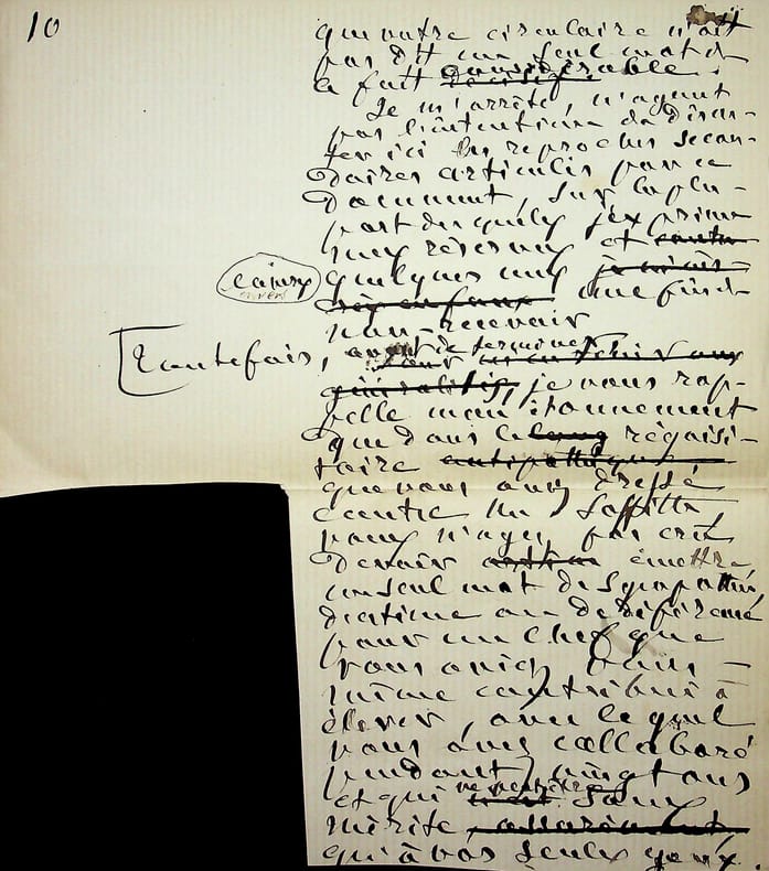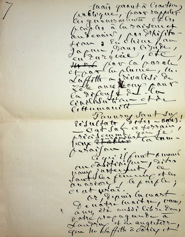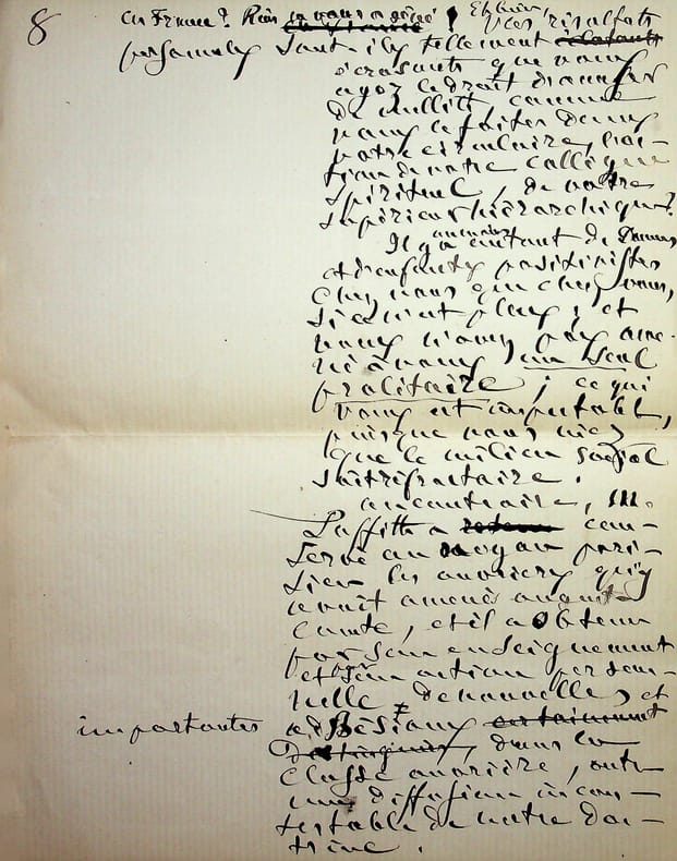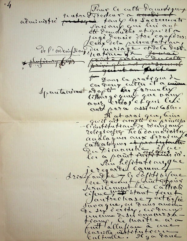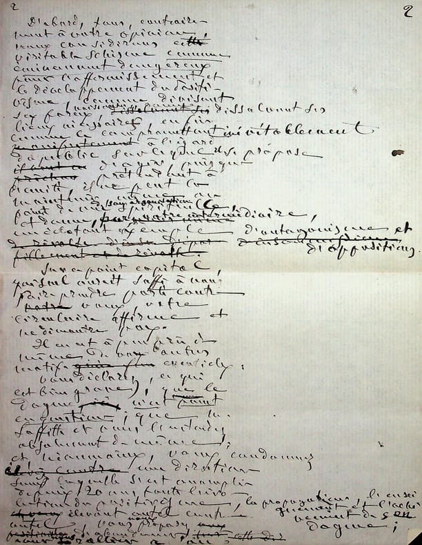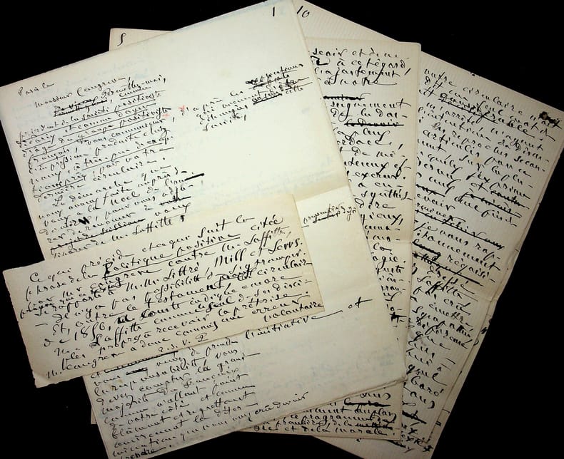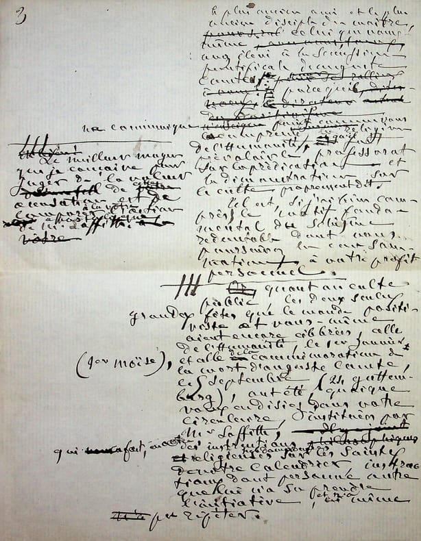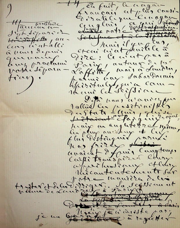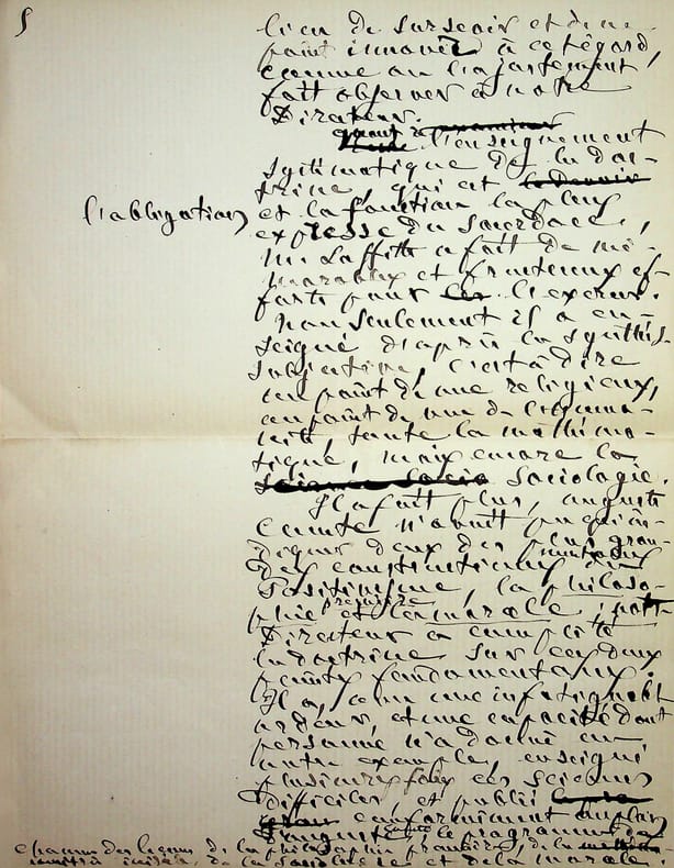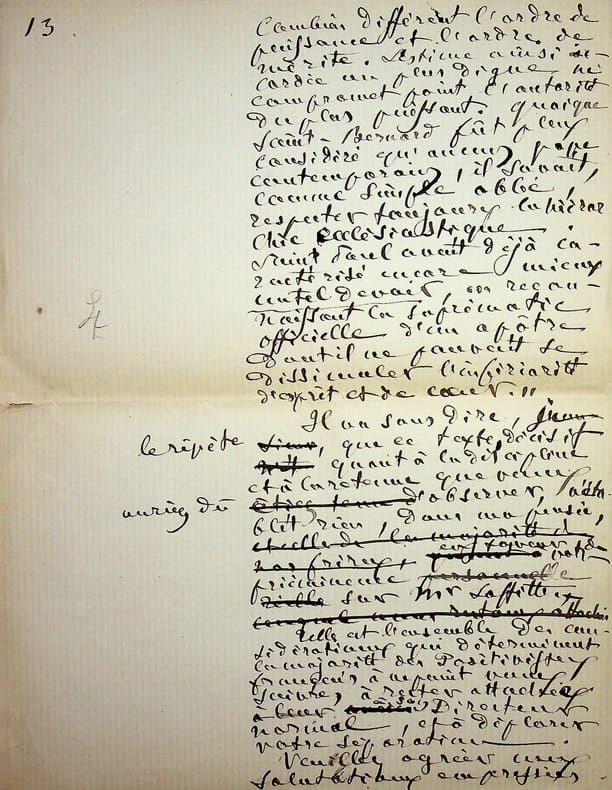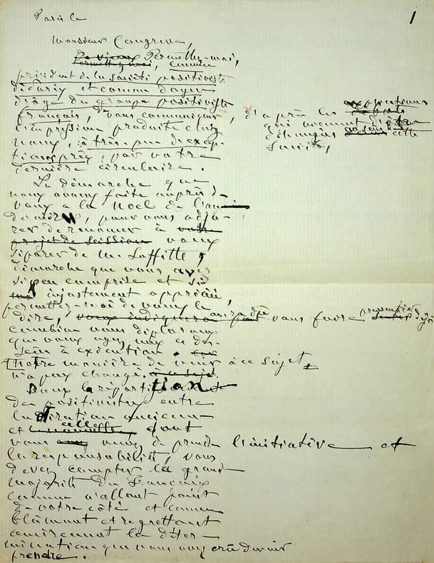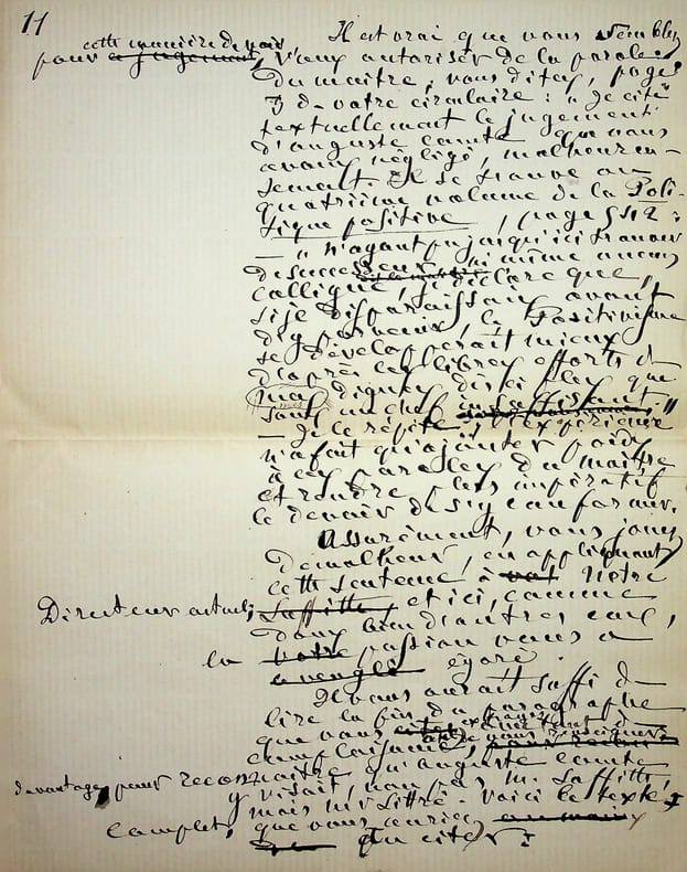 [Positivisme] Jean-François Robinet (1825-1899), médecin, historien, communard, médecin d'Auguste Comte, important membre de l'église positiviste. Brouillon autographe, sd [fin 1877?], 13p in-4. Extraordinaire brouillon de la lettre à Richard Congreve (1818-1899), philosophe anglais, figure de proue du positivisme en Angleterre, à l'origine du schisme en 1878. Ce brouillon intervient au moment du schisme entre les anglais et les français. Ce document de premier ordre montre toutes les différences de point de vue entre les deux pays. Très importante document. [484]