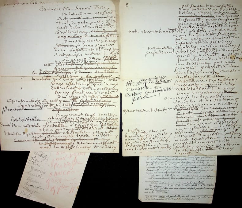 [Positivisme] Jean-François Robinet (1825-1899), médecin, historien, communard, médecin d'Auguste Comte, important membre de l'église positiviste. Brouillon autographe, sd [fin 1877?], 13p in-4. Extraordinaire brouillon de la lettre à Richard Congreve (1818-1899), philosophe anglais, figure de proue du positivisme en Angleterre, à l'origine du schisme en 1878. Ce brouillon intervient au moment du schisme entre les anglais et les français. Ce document de premier ordre montre toutes les différences de point de vue entre les deux pays. Très importante document. [484]