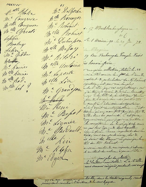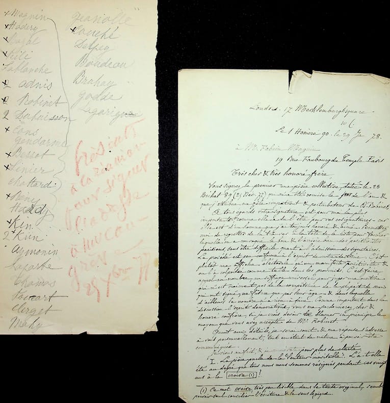 [Positivisme] Jean-François Robinet (1825-1899), médecin, historien, communard, médecin d'Auguste Comte, important membre de l'église positiviste. Brouillon autographe, 25 décembre 1877, 2p in-4. Important brouillon de l'adresse des positivistes français à Richard Congreve (1818-1899), philosophe anglais, figure de proue du positivisme en Angleterre, à l'origine du schisme en 1878. L'envoi de ce texte fut décidé à la réunion du 25 décembre 1877, comme le montre notamment un petit papier joint (d'une autre main) avec la liste membres présents (liste très intéressante pour connaître les noms de positivistes actifs alors). Au dos de ce papier se trouvent une liste de positivistes françaises et anglaises. On joint la copie de la réponse de Congreve à Fabien Magnin, faisant diverses observations tant sur le fonds (problème qui n'est pas de la compétence des signataires) que de la forme (« le nombre n'a rien à faire »). Très bel ensemble. [484]