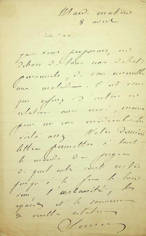 [Positivisme] Eugène Sémérie (1832-1884), positiviste, médecin. L.A.S., 8 avril [1878?], 1p in-8. Au docteur Jean-François Robinet (1825-1899), important membre de l'église positiviste. « Je vous proposais, en dehors de tous nos débats personnels, de voir ensemble une malade. C'est vous qui refusez d'entrer en relation avec moi, même pour un cas médical. En voilà assez. Votre dernière lettre permettra à tout le monde de quel côté sont restés jusqu'à la fin le bon sens, l'urbanité, les égards et le souvenir de vieilles relations. Sémérie ». Cette lettre est probablement en 1878, juste avant la rupture définitive (schisme) au sein de l'église positiviste. Elle montre bien les relations distendues entre les deux anciens amis. [484]