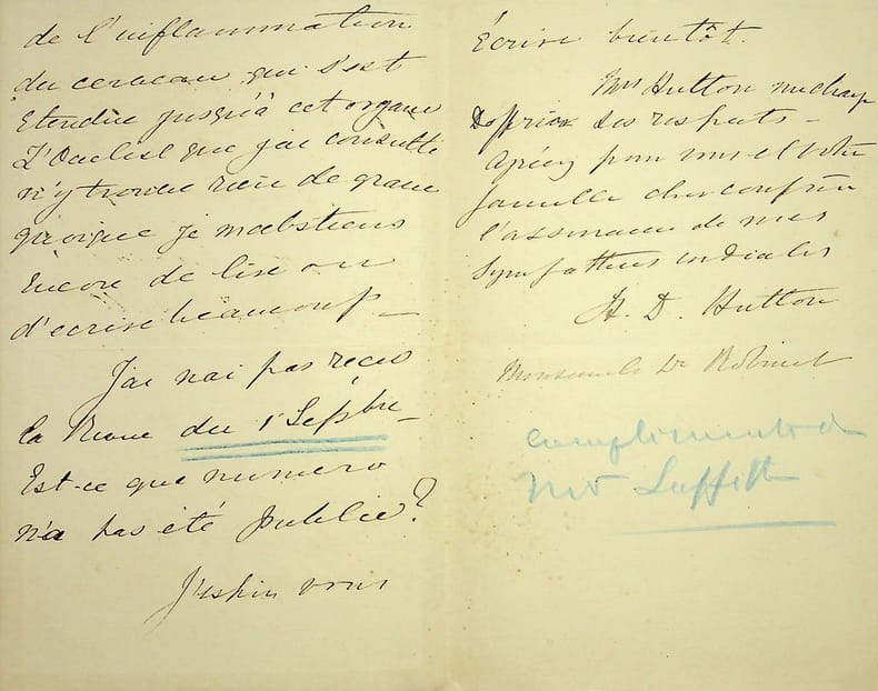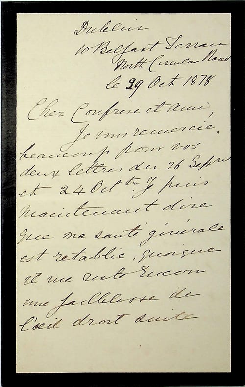 Henry Dix Hutton (1824-1907), bibliothécaire du Trinity College (Dublin), protestant devenu positiviste, traducteur d'Auguste Comte en anglais. L.A.S., Dublin, 29 octobre 1878, 2p 1/2 in-8. Au docteur Jean-François Robinet (1825-1899), important membre de l'église positiviste. Il le remercie pour ses lettres, sa santé est presque rétablie. Il signale ne pas avoir reçu la revue du 1er septembre. Peu commun. [484]