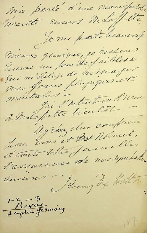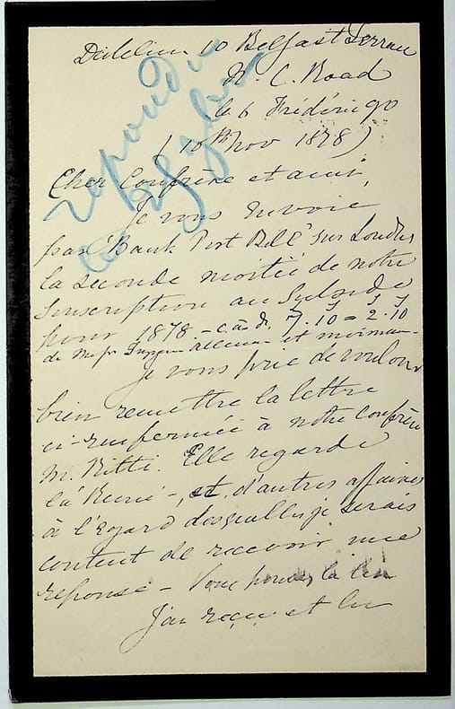 Henry Dix Hutton (1824-1907), bibliothécaire du Trinity College (Dublin), protestant devenu positiviste, traducteur d'Auguste Comte en anglais. L.A.S., 6 Frédéric 90 [10 novembre 1878], 4p in-8. Au docteur Jean-François Robinet (1825-1899), important membre de l'église positiviste. Il envoie une partie du subside positiviste. Il suit les discussions des positivistes anglais : « les circulaires du Dr [Richard] Congreve ainsi que les réponses des Dr [John Henry] Bridges, [Edward Spencer] Beesly et de M. [Godfrey] Lushington. Je n'ai pas besoin de dire que les discussions et les évènements qui ont eu lieu sont très pénibles mais il aurait été aussi inutile qu'impossible pour notre groupe irlandais d'y intervenir ». Rappelons que Congreve est à l'origine du schisme anglais. Peu commun. [484]