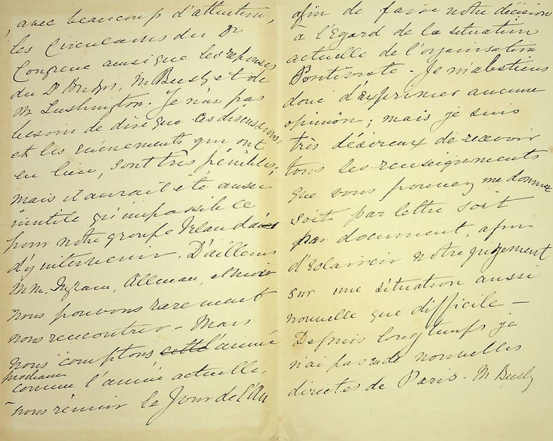 [Positivisme] Richard Congreve (1818-1899), philosophe anglais, figure de proue du positivisme en Angleterre, à l'origine du schisme en 1878 ; Mary Bury Congreve (1833-1915), épouse du philosophe ; Emily Bury Geddes (1840-1929), soeur de Mary ; James Geddes (1841-1880), époux d'Emily. L.A.S. de Mary Congreve en français & L.A.S. de Richard Congreve en françaisn contre signée par Emily et James Geddes, 15-16 Moïse 90 [15-16 janvier 1878], 6p in-8. A Mary Weyer Robinet (1827-1881), épouse du docteur Jean-François Robinet (1825-1899), médecin d'Auguste Comte et important positiviste français. « Ma chère amie, En recevant votre lettre, j'ai regretté plus que je ne saurais vous dire d'avoir tant ajourné la réponse que je vous avais, je crois, promise dans une lettre à Virginie, et qu'elle en doit pas avoir lue il me semble ou avoir interprétée dans la même manière que vous. Ayez la bonté de vérifier cela, car cela vous convaincrait que je n'ai aucunement désiré une séparation ou cessation stricte de correspondance. Pour éviter toute méprise, je la prie de me la renvoyer si elle l'a scellée jusqu'ici. Je la lui renverrais si elle veut. Je me reposais sur ce que vous me disiez dans votre bonne lettre de nouvel an où vous me dites : "Si je ne vous ai pas écrit dans ces derniers temps, c'est que je n'ai pas su avec quel désir de liberté je pouvais le faire sans blesser vos sentiments personnes" et puisque vous me parlez de souffrances, du reste je l'avais désiré, vous ne devez pas être surprise que, ne l'étant pas je crois moins, je ressentis de la peine à répondre simplement[?]. Mais je me serais épargné encore une douleur si j'y avais mis plus de promptitude. Ce que j'allais vous dire vous aurait peut-être empêchée de m'écrire sur ce sujet, ce qui eût été mieux pour toutes les deux. Car évidemment, situées comme nous sommes, les mesures étant dans d'autres mains, la meilleure chose que nous avons à faire, c'est de garder le contact[?] autant que possible et de fortifier[?] nos affections sans laisser aveugler notre jugement, voilà ce que j'entendais par mon amitié subjective pour ainsi dire - réelle autant que vous voulez, mais ne se permettant pas de visiter les choses présentes qui nous intéressent - peut-être trop. Et vous me parle de votre projet comme si le but de cette entrevue Boulevard dde la Madeleine n'était pas que M. Robinet nous exposât les raisons d'une démarche qu'il désirait tant, disait-il, pour le positivisme (il n'a presque pas été question de nos personnalités mais de nos devoirs-sacrifices a-t-il dit) et qui me répugnent tant à moi - démarche dont les inconvénients qu'il regrettait en [mot illisible] était surtout pour nous dans le cas que M. Laffitte ne se résignerait pas (ce que vous avez, vous et lui, dit qu'il ferait probablement). Que son affection pour M. Laffitte était profonde, cela se voyait, et qui a ajouté un grand poids à sa désapprobation de la directions, mais c'était comme moyen d'éviter un schisme, que M. Robinet a insisté sur notre venue et c'était en vue de ce schisme, qu'il ne contemplait que dans le cas que M. Congreve se refuserait de venir à Paris que M. Robinet, vous aussi je crois, vous avez dit que vous resteriez du côté de M. Laffitte. C'était nous, au contraire, qui nous sommes alors, comme plus tard, opposés à l'espèce de substitution sourde que vous avez désirée, et qui ne nous a pas parue désirer de mon mari. Aucune déclaration que M. Robinet se rangerait du côté de M. Laffitte si, mon mari venant, les choses [mot illisible] mal, n'a été faite. Il y a eu, je crois, confusion dans votre mémoire entre cette entrevue et la correspondance des dernières semaines de l'an passé. Dans la première, il n'y avait rien qui aurait pu nous blesser ni dans les expressions que je vous cite de la chose que vous avez écrite à M. Congreve beaucoup plus tard - elle est datée le 27 Descartes 89. "Il est pour moi hors de doute que votre présence à Paris serait le salut du Positivisme et la seule