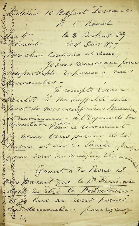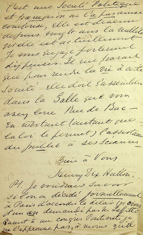 Henry Dix Hutton (1824-1907), bibliothécaire du Trinity College (Dublin), protestant devenu positiviste, traducteur d'Auguste Comte en anglais. L.A.S., 3 Bichat 89 [5 décembre 1877], 4p in-8. Au docteur Jean-François Robinet (1825-1899), important membre de l'église positiviste. Longue lettre à propos de diverses affaires, une lettre qu'il doit écrire à Pierre Laffitte, Eugène Sémérie qui refuse de prendre la direction de la Revue alors qu'il le voulait l'année précédent [Sémérie est sur le point de faire un schisme], des orientations que doit prendre la revue, etc. Belle lettre, peu commun. [484]