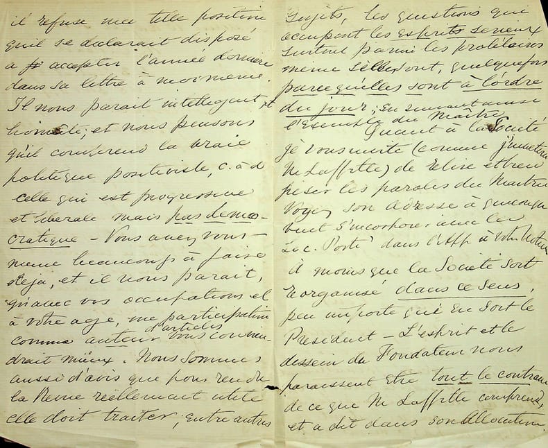 [Positivisme] Richard Congreve (1818-1899), philosophe anglais, figure de proue du positivisme en Angleterre, à l'origine du schisme en 1878 ; Mary Bury Congreve (1833-1915), épouse du philosophe ; Emily Bury Geddes (1840-1929), soeur de Mary ; James Geddes (1841-1880), époux d'Emily. L.A.S. de Mary Congreve en français & L.A.S. de Richard Congreve en françaisn contre signée par Emily et James Geddes, 15-16 Moïse 90 [15-16 janvier 1878], 6p in-8. A Mary Weyer Robinet (1827-1881), épouse du docteur Jean-François Robinet (1825-1899), médecin d'Auguste Comte et important positiviste français. « Ma chère amie, En recevant votre lettre, j'ai regretté plus que je ne saurais vous dire d'avoir tant ajourné la réponse que je vous avais, je crois, promise dans une lettre à Virginie, et qu'elle en doit pas avoir lue il me semble ou avoir interprétée dans la même manière que vous. Ayez la bonté de vérifier cela, car cela vous convaincrait que je n'ai aucunement désiré une séparation ou cessation stricte de correspondance. Pour éviter toute méprise, je la prie de me la renvoyer si elle l'a scellée jusqu'ici. Je la lui renverrais si elle veut. Je me reposais sur ce que vous me disiez dans votre bonne lettre de nouvel an où vous me dites : "Si je ne vous ai pas écrit dans ces derniers temps, c'est que je n'ai pas su avec quel désir de liberté je pouvais le faire sans blesser vos sentiments personnes" et puisque vous me parlez de souffrances, du reste je l'avais désiré, vous ne devez pas être surprise que, ne l'étant pas je crois moins, je ressentis de la peine à répondre simplement[?]. Mais je me serais épargné encore une douleur si j'y avais mis plus de promptitude. Ce que j'allais vous dire vous aurait peut-être empêchée de m'écrire sur ce sujet, ce qui eût été mieux pour toutes les deux. Car évidemment, situées comme nous sommes, les mesures étant dans d'autres mains, la meilleure chose que nous avons à faire, c'est de garder le contact[?] autant que possible et de fortifier[?] nos affections sans laisser aveugler notre jugement, voilà ce que j'entendais par mon amitié subjective pour ainsi dire - réelle autant que vous voulez, mais ne se permettant pas de visiter les choses présentes qui nous intéressent - peut-être trop. Et vous me parle de votre projet comme si le but de cette entrevue Boulevard dde la Madeleine n'était pas que M. Robinet nous exposât les raisons d'une démarche qu'il désirait tant, disait-il, pour le positivisme (il n'a presque pas été question de nos personnalités mais de nos devoirs-sacrifices a-t-il dit) et qui me répugnent tant à moi - démarche dont les inconvénients qu'il regrettait en [mot illisible] était surtout pour nous dans le cas que M. Laffitte ne se résignerait pas (ce que vous avez, vous et lui, dit qu'il ferait probablement). Que son affection pour M. Laffitte était profonde, cela se voyait, et qui a ajouté un grand poids à sa désapprobation de la directions, mais c'était comme moyen d'éviter un schisme, que M. Robinet a insisté sur notre venue et c'était en vue de ce schisme, qu'il ne contemplait que dans le cas que M. Congreve se refuserait de venir à Paris que M. Robinet, vous aussi je crois, vous avez dit que vous resteriez du côté de M. Laffitte. C'était nous, au contraire, qui nous sommes alors, comme plus tard, opposés à l'espèce de substitution sourde que vous avez désirée, et qui ne nous a pas parue désirer de mon mari. Aucune déclaration que M. Robinet se rangerait du côté de M. Laffitte si, mon mari venant, les choses [mot illisible] mal, n'a été faite. Il y a eu, je crois, confusion dans votre mémoire entre cette entrevue et la correspondance des dernières semaines de l'an passé. Dans la première, il n'y avait rien qui aurait pu nous blesser ni dans les expressions que je vous cite de la chose que vous avez écrite à M. Congreve beaucoup plus tard - elle est datée le 27 Descartes 89. "Il est pour moi hors de doute que votre présence à Paris serait le salut du Positivisme et la seule