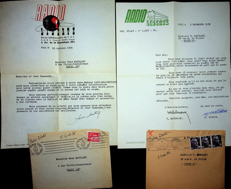 Pierre Autry (1902-ap.1967), écrivain, syndicaliste, résistant. L.S. + enveloppe, Paris, 15 octobre 1936, 1p in-4. A l'écrivain et militant communiste René Maublanc (1891-1960). Il souhaite que Maublanc participe à sa revue naissante, Radio Liberté dont le premier numéro parait le lendemain. [485]
