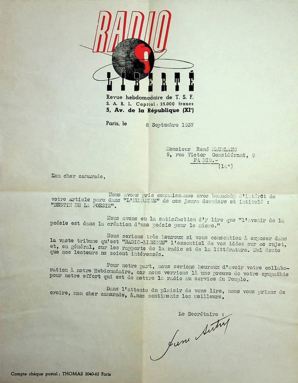 Pierre Autry (1902-ap.1967), écrivain, syndicaliste, résistant. L.S., Paris, 6 septembre 1937, 1p in-4. A l'écrivain et militant communiste René Maublanc (1891-1960). Ayant lu l'article Destin de la Poésie dans le journal L'Humanité, il souhaite que Maublanc expose sa vision de la poésie dans la revue Radio Liberté. [485]