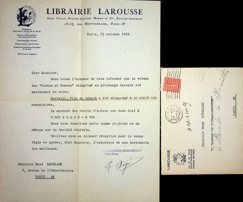 Paul Augé (1881-1951), éditeur, lexicographe. L.S. + enveloppe, Paris, 31 octobre 1929, 1p in-4. A l'écrivain et militant communiste René Maublanc (1891-1960). A propos de l'édition de son livre, Derradji fils du désert. [485]
