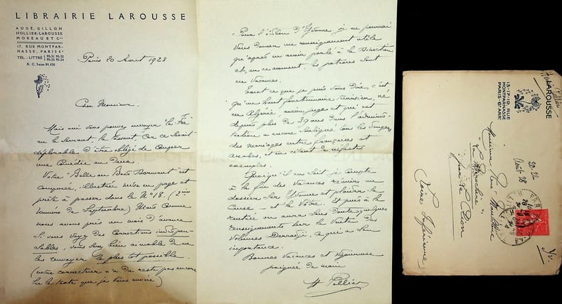 Henri Pellier (1863-1942), écrivain, dramaturge, scénariste. L.A.S. + enveloppe, Paris, 20 août 1928, 2p in-8. A l'écrivain et militant communiste René Maublanc (1891-1960). Entête de la librairie Larousse. A propos de l'édition de pièces dans la revue L'Age heureux (éditée par Larousse) et la publication de son ouvrage Yvonne au Pays de Derradji. Il parle notamment (en lien avec le livre) du témoignage d'un « haut fonctionnaire tunisien » sur les « dangers des mariages entre françaises et arabes, et en citant de néfastes exemples ». [485]