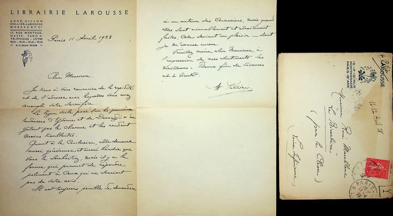 Henri Pellier (1863-1942), écrivain, dramaturge, scénariste. L.A.S. + enveloppe, Paris, 11 avril 1928, 1p 1/2 in-8. A l'écrivain et militant communiste René Maublanc (1891-1960). Entête de la librairie Larousse. A propos de son roman Yvonne au Pays de Derradji que Maublanc a accepté de modifier pour l'édition. [485]