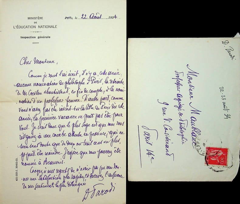 Dominique Parodi (1870-1955), philosophe, inspecteur général. L.A.S. + enveloppe, 22 août 1934, 1p in-8. A l'écrivain et militant communiste René Maublanc (1891-1960). Il regrette de ne pouvoir donner satisfaction à Maublanc qui souhaite être nommé à Paris. Il lui dit d'attendre deux ou trois ans. Maublanc reviendra à Paris en 1936. [485]