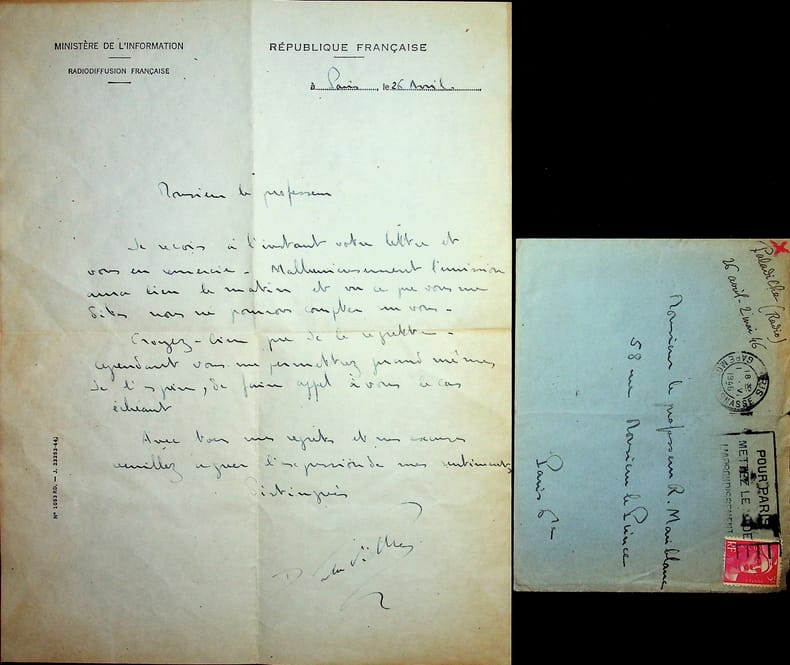 Dominique Paladilhe (1921-2015), historien, illustrateur. L.A.S. + enveloppe, Paris, 26 avril 1946, 1p in-4. A l'écrivain et militant communiste René Maublanc (1891-1960), qui fut son professeur. Il regrette de ne pouvoir compter sur lui pour une émission. Il s'agissait d'une émission sur « la part de la liberté dans la révolution ». [485]