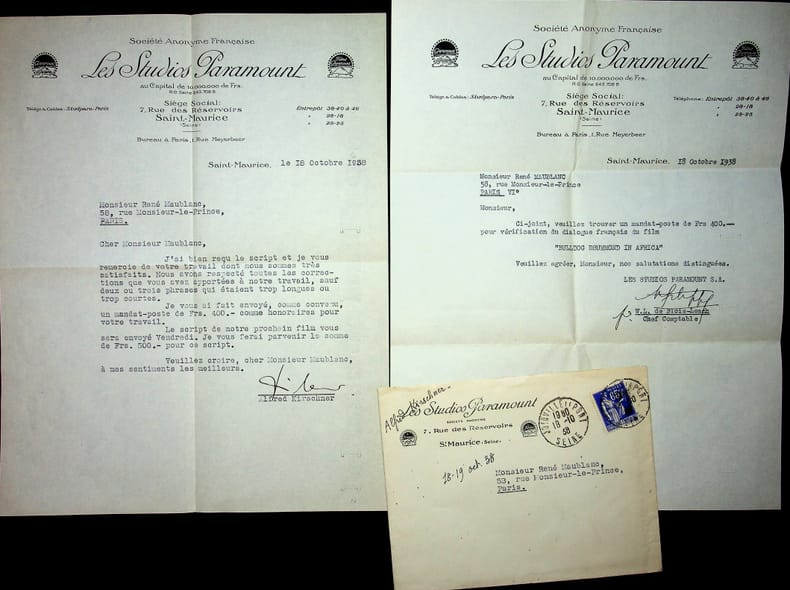 Alfred Kirschner (?-1961), producteur de cinéma, exploitant d'un studio de doublage, membre des studios Paramount. L.S. + enveloppe, Saint-MAurice, 18 octobre 1938, 1p in-4. A l'écrivain et militant communiste René Maublanc (1891-1960). Il est satisfait du script corrigé envoyé par Maublanc et lui en annonce un autre. On joint une lettre d'un autre membre des studios concernant le paiement. On y apprend qu'il s'agissait du script de Bulldog Drummond in Africa, vraisemblablement de la traduction en français (le film étant sorti le 5 août 1938). [485]