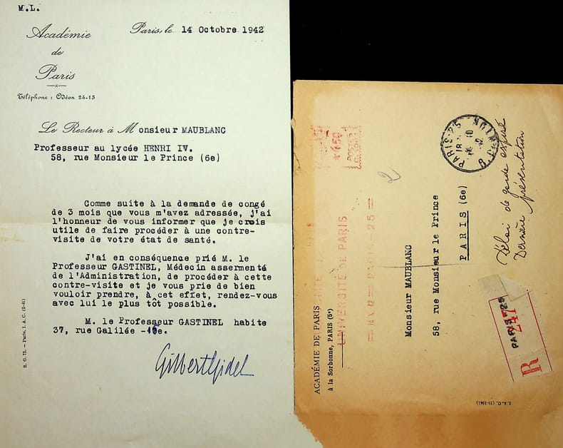 Gilbert Gidel (1880-1958), juriste, professeur d'université, spécialiste du droit maritime, recteur de l'Université de Paris. L.S. + enveloppe, Paris, 23 octobre 1942, 1p in-4. A l'écrivain et militant communiste René Maublanc (1891-1960). Compte-tenu de l'absence de Maublanc à un visite médicale, il le considère « comme en état d'abandon de poste ». Cette copie est celle envoyée au professeur du Lycée Marcelin Berthelot de Saint-Maur-des-Fossés (il était aussi professeur au lycée Henri IV et a reçu la même lettre pour la même raison). [485]